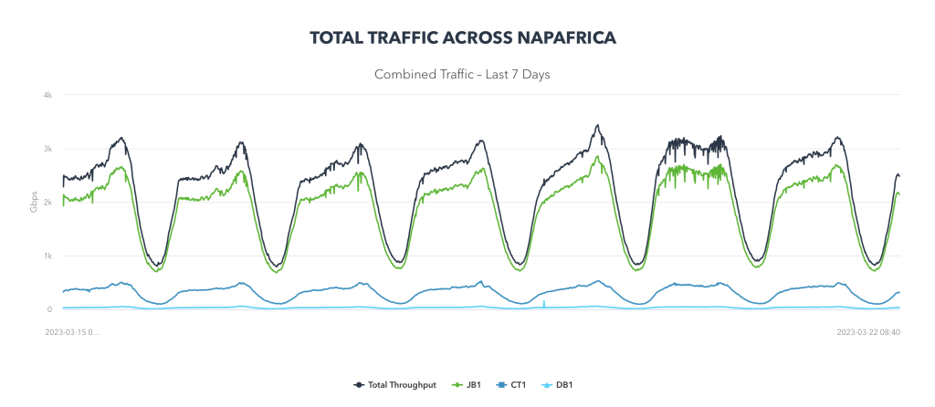 Johannesburg, South Africa – 23 March 2023 – On the evening of 15 February, NAPAfrica, the African continent’s largest internet exchange point (IXP), reached the 3Tbps traffic threshold. This peak in internet traffic was experienced globally on the back of some significant new gaming releases and software updates. This increase in NAPAfrica’s average traffic throughput has continued and peaked at 3.44Tbps on 19 March.